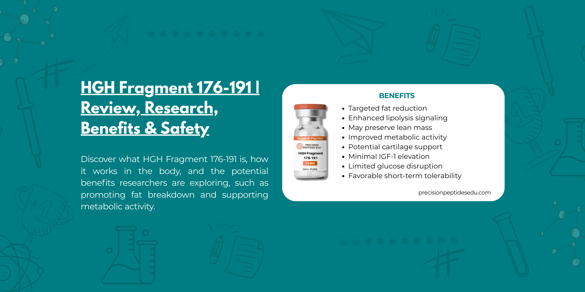 HGH Fragment 176-191 is a promising tool in fat-metabolism research, known to enhance lipolysis and reduce lipogenesis in laboratory and animal studies — without the broad endocrine effects seen with full HGH. However, human evidence of meaningful benefits and long-term safety is currently insufficient, and available data mainly arises from small, short-term investigations or analogues related to the peptide.